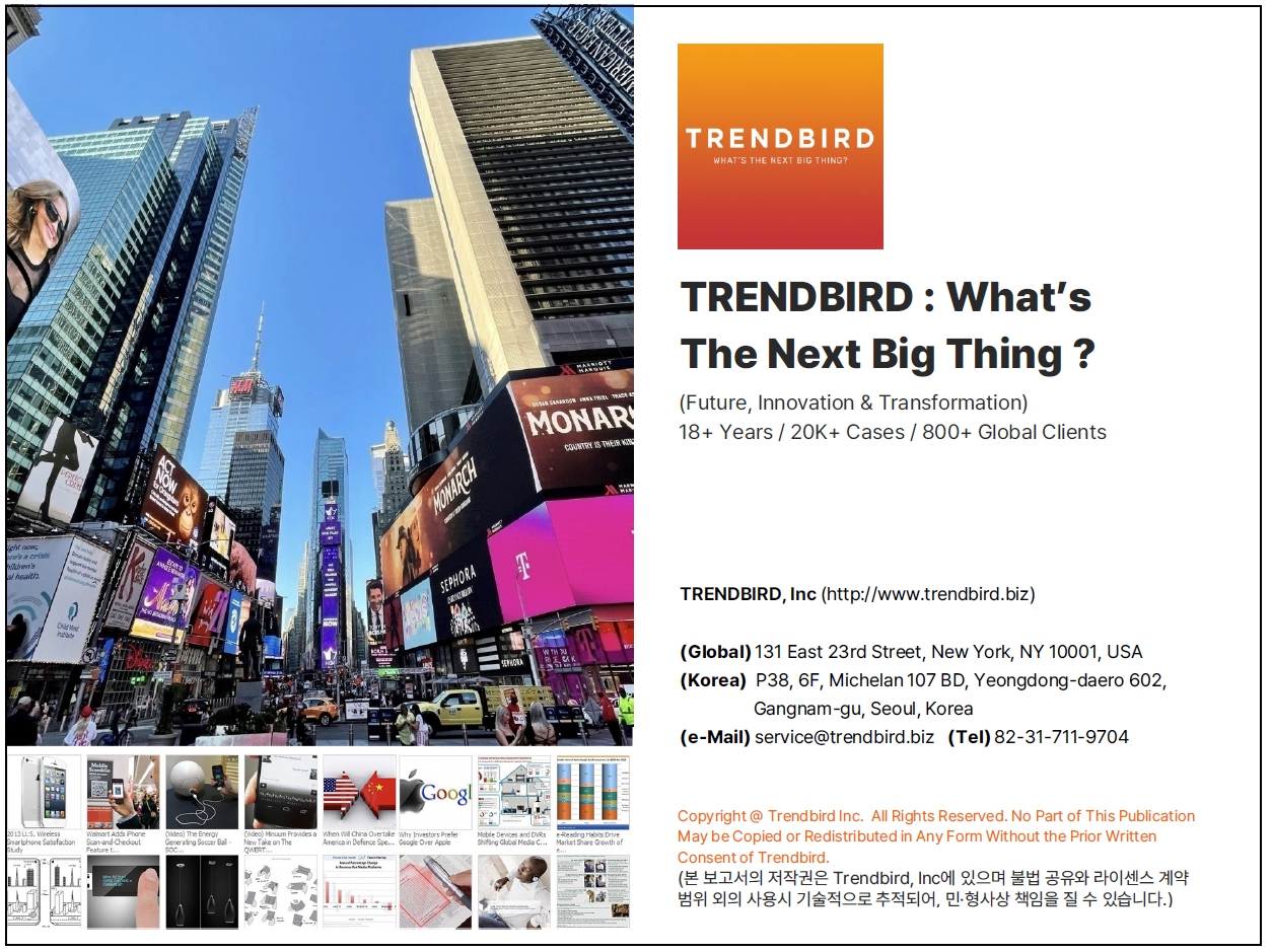 * TRENDBIRD는 Global Trend Sensing & Market Intelligence 서비스로, 800여개 글로벌 기업의 CEO와 경영진들이 18년간 구독해 온 높은 신뢰도의 서비스로 85%를 상회하는 재계약률을 자랑합니다.