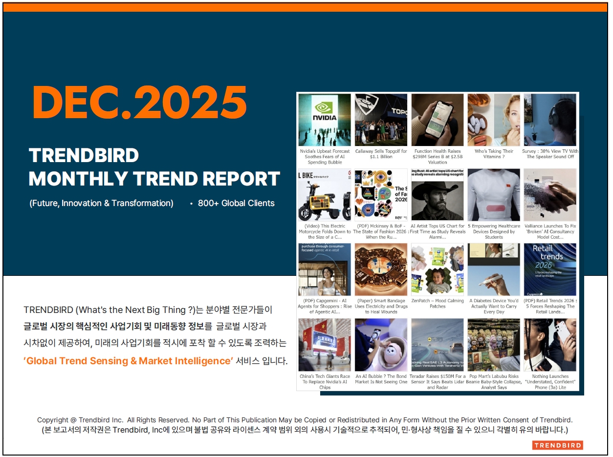 "Trendbird Monthly Report는 비즈니스, 기술, 제품, 디자인 및 투자 시장에 걸친 광범위한 글로벌 동향을 제시합니다. 소비 분야에서는 젊은 세대(MZ세대)의 유입으로 크루즈 여행객 수가 팬데믹 이전 수준을 초과하며 급증했고, Dyson은 프리미엄 헤어케어 제품으로 성공적으로 사업 영역을 확장했습니다. 혁신 기술 측면에서는 고성능 칩의 과열을 막기 위한 마이크로유체 기반 냉각 솔루션과, 주행 감성을 극대화하는 Porsche의 터널 모드 특허 등록이 눈에 띕니다. 또한, AI는 음식물 쓰레기를 추적하는 시스템부터 개인의 통증 민감도를 정량화하는 뇌전도 기반 플랫폼에 이르기까지 광범위하게 적용되고 있습니다. 디자인 부문에서는 계단을 오르는 자율 주행 휠체어와 착용자의 통증을 완화하는 스마트 양말 같은 미래 지향적인 제품들이 소개되었습니다. 마지막으로, 시장 지표로는 버핏 지수가 사상 최고치를 기록하는 가운데 Jeff Bezos가 물리적 세계 AI 스타트업에 대규모 투자를 단행하며 주목받고 있습니다."