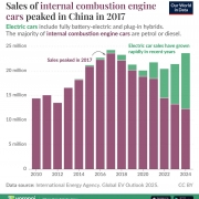 Bar chart showing that internal combustion engine car sales peaked in China in 2017, with electric vehicle sales rising sharply by 2024.Sales of internal combustion engine (ICE) cars in China peaked in 2017 at over 24 million units.Electric vehicles (EVs) now make up nearly half of all new car sales in the country.Government policies, local incentives, and falling EV prices have all contributed...