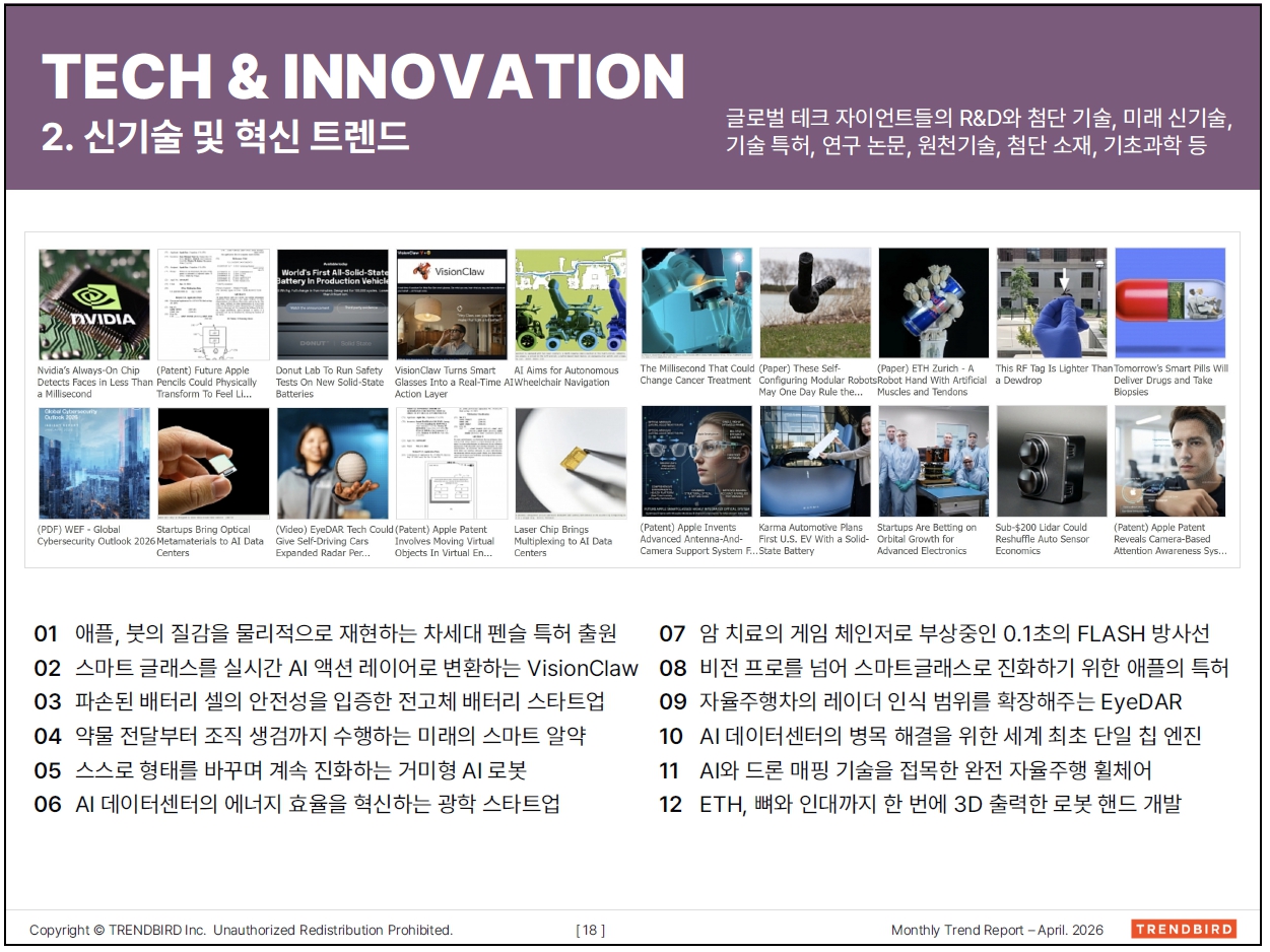 자율 진화형 로봇과 생체 모방 기술의 결합: 스스로 형태를 바꾸며 적응하는 거미형 AI 로봇 '메타머신(Metamachine)'과 인체 조직을 정밀하게 모방하여 3D 출력한 로봇 손 등, 고정된 형태를 벗어나 환경에 유연하게 대응하는 지능형 로보틱스 기술이 실현되고 있습니다. * 데이터센터의 광학적 전환과 에너지 효율 혁신: AI 연산 병목을 해결하기 위해 구리 배선을 광섬유로 대체하는 실리콘 포토닉스 및 전력 효율을 50배 이상 높이는 광 메타물질 칩이 차세대 인프라의 필수 동력으로 부상하며 AI 성장의 기술적 한계를 극복하고 있습니다.