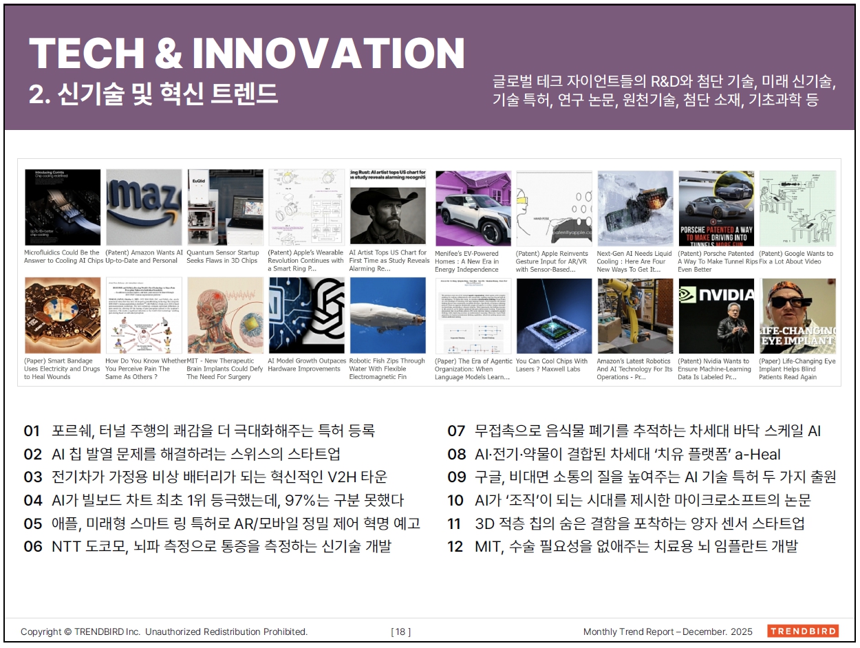 "Trendbird Monthly Report는 비즈니스, 기술, 제품, 디자인 및 투자 시장에 걸친 광범위한 글로벌 동향을 제시합니다. 소비 분야에서는 젊은 세대(MZ세대)의 유입으로 크루즈 여행객 수가 팬데믹 이전 수준을 초과하며 급증했고, Dyson은 프리미엄 헤어케어 제품으로 성공적으로 사업 영역을 확장했습니다. 혁신 기술 측면에서는 고성능 칩의 과열을 막기 위한 마이크로유체 기반 냉각 솔루션과, 주행 감성을 극대화하는 Porsche의 터널 모드 특허 등록이 눈에 띕니다. 또한, AI는 음식물 쓰레기를 추적하는 시스템부터 개인의 통증 민감도를 정량화하는 뇌전도 기반 플랫폼에 이르기까지 광범위하게 적용되고 있습니다. 디자인 부문에서는 계단을 오르는 자율 주행 휠체어와 착용자의 통증을 완화하는 스마트 양말 같은 미래 지향적인 제품들이 소개되었습니다. 마지막으로, 시장 지표로는 버핏 지수가 사상 최고치를 기록하는 가운데 Jeff Bezos가 물리적 세계 AI 스타트업에 대규모 투자를 단행하며 주목받고 있습니다."