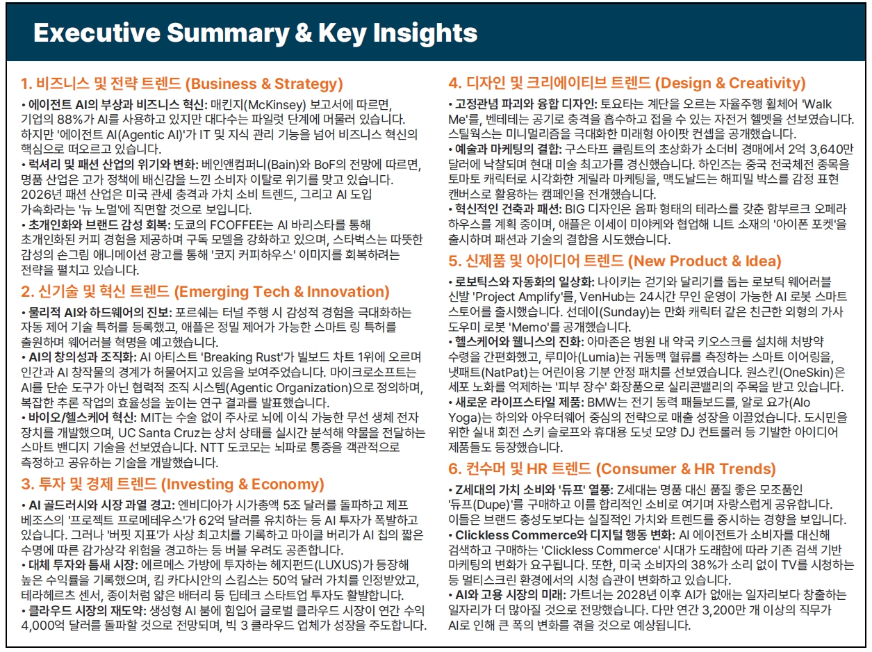 * TRENDBIRD는 Global Trend Sensing & Market Intelligence 서비스로, 800여개 글로벌 기업의 CEO와 경영진들이 18년간 구독해 온 높은 신뢰도의 서비스로 85%를 상회하는 재계약률을 자랑합니다.
