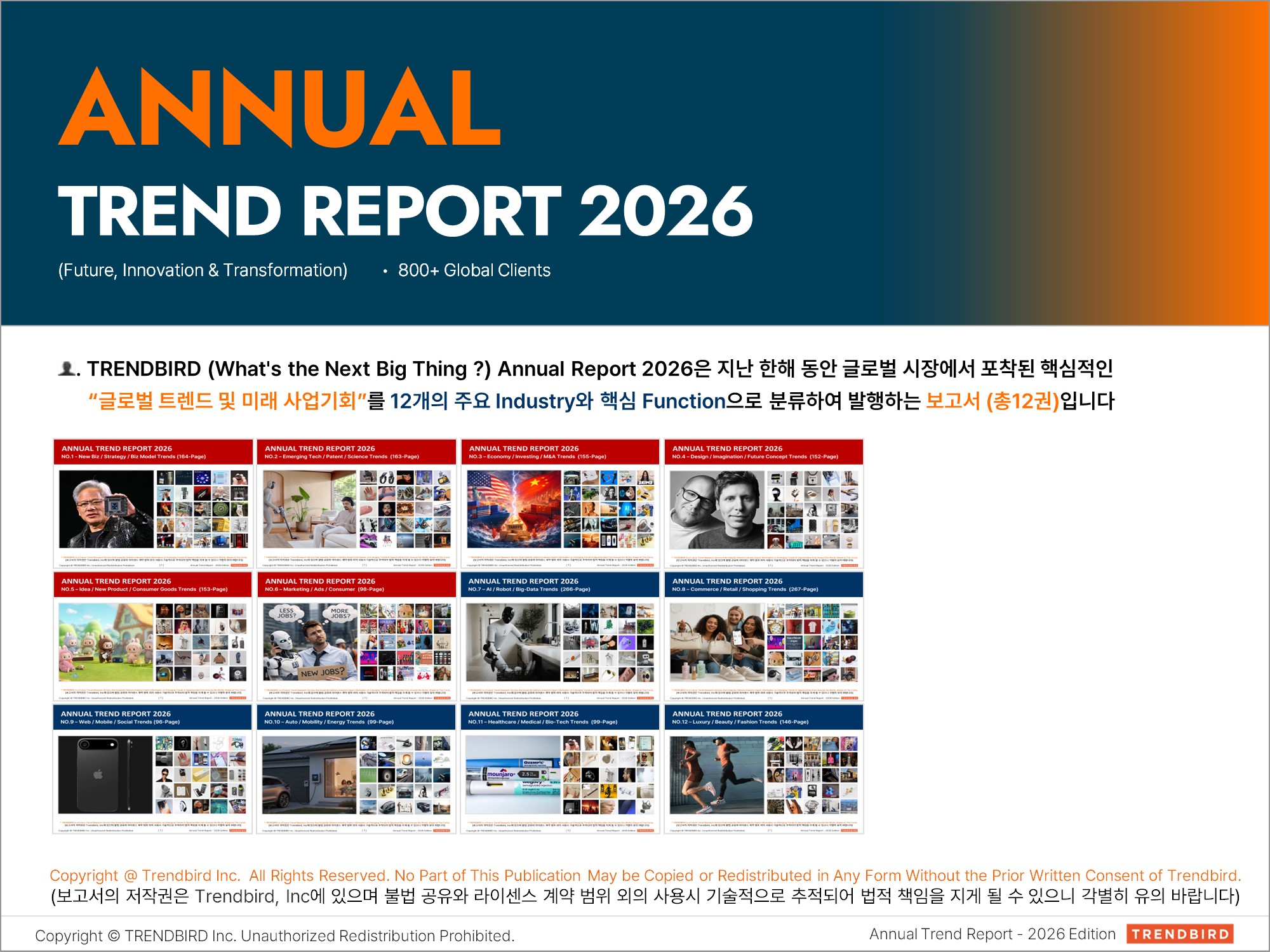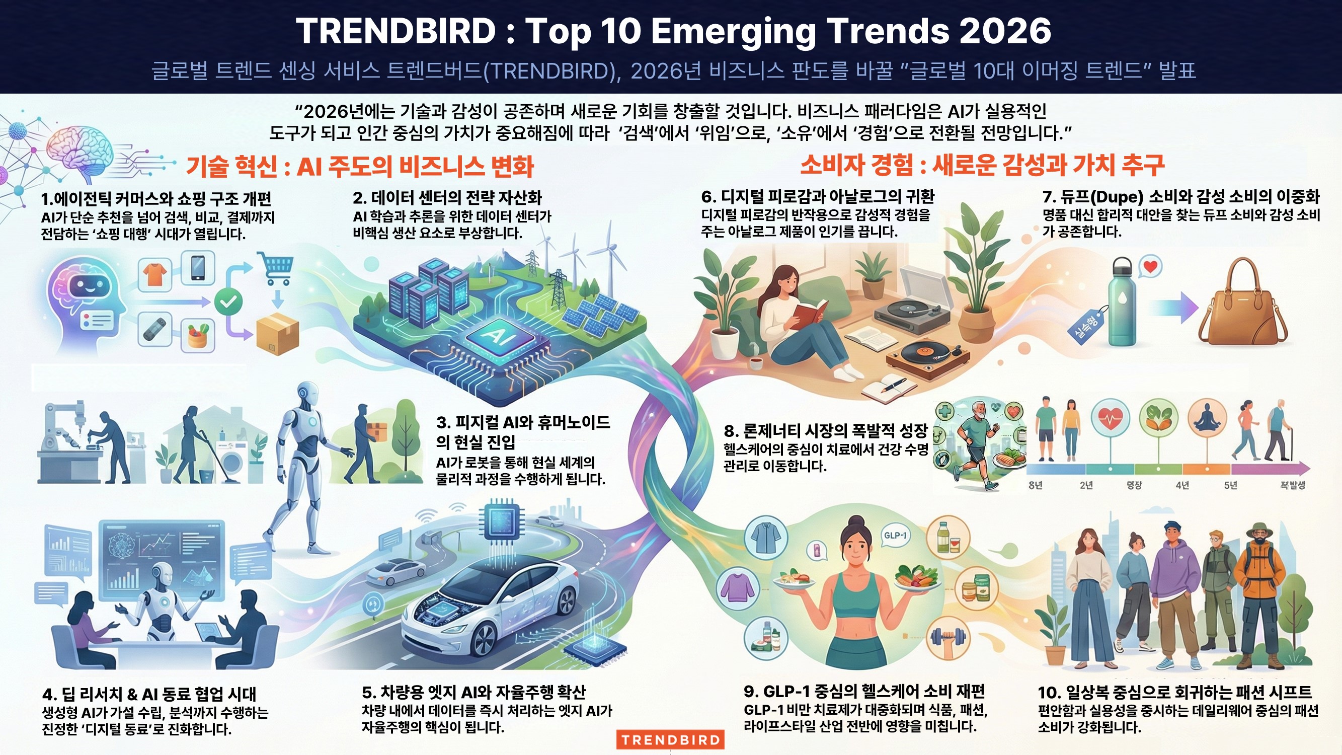 지난 19년간 삼성, 현대차, SK, LG 등 800여 개 글로벌 선도 기업에 미래 전략 정보를 제공해 온 트렌드버드는 2026년은 AI 기술이 산업 전반에 실질적으로 적용되는 동시에, 이에 대한 반작용으로 인간 고유의 감성과 경험의 가치가 높아지는 '기술과 감성의 공존기'가 될 것이며, 비즈니스 패러다임이 '탐색'에서 '위임'으로, '소유'에서 '경험'으로 전환될 것으로 전망했다.