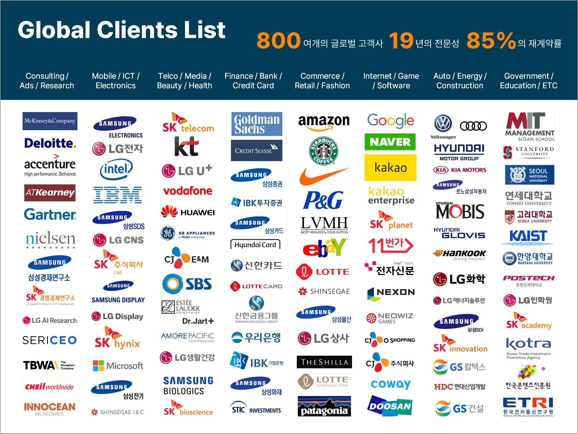 - 800여개 선도 기업의 CEO/경영진 및 미래전략/신사업, R&D/선행 기술연구소, AI 전략/기술, 마케팅/디자인, UX/CX센터, CVC 등 신사업 및 신기술 발굴에 활용 중