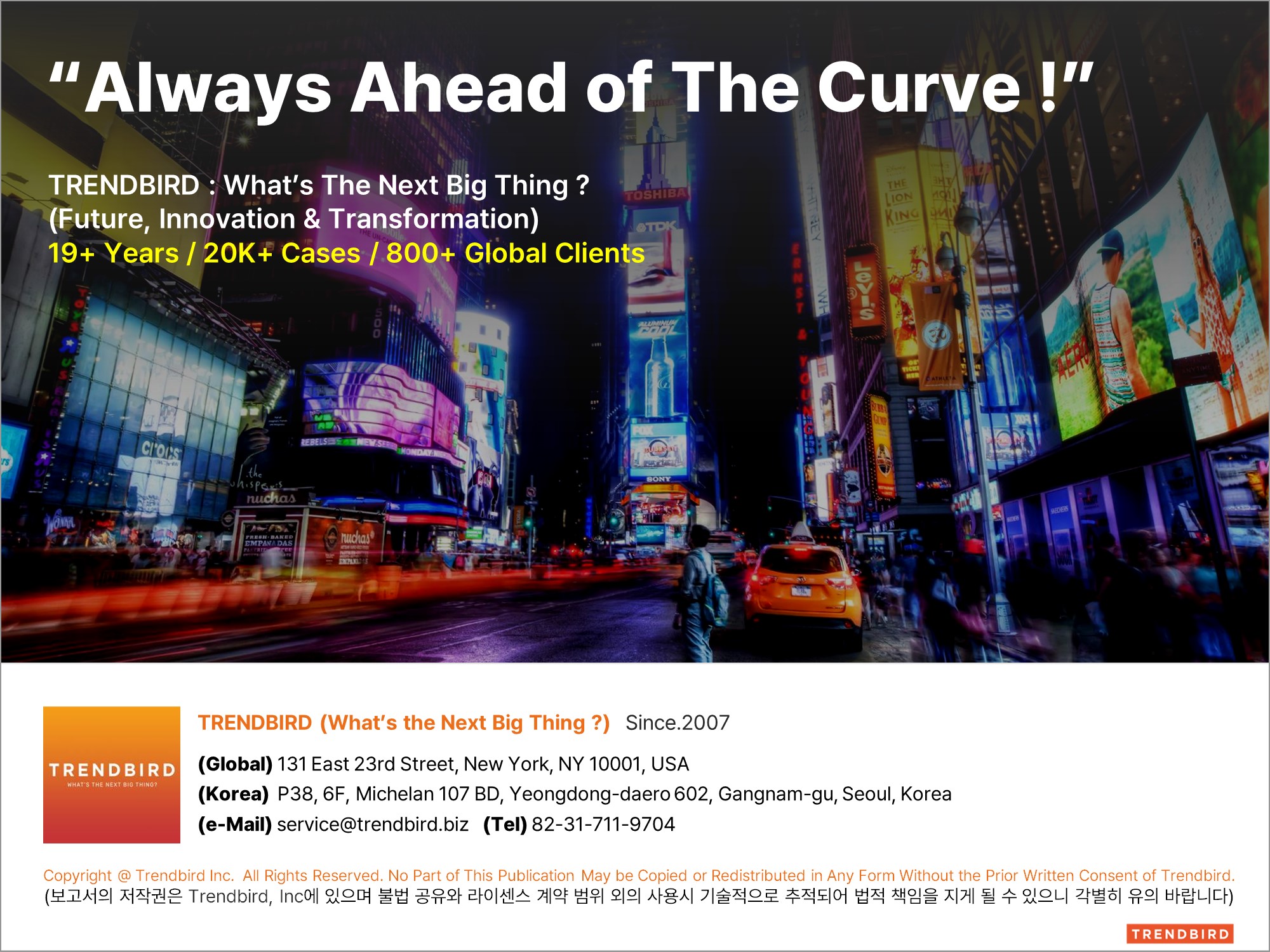 트렌드버드(www.trendbird.biz)는 분야별 전문가들이 글로벌 시장의 핵심적인 유망 신사업, 첨단기술, 미래디자인, 신제품, 자본시장, 컨슈머 등의 미래동향 정보를 글로벌 시장과 시차없이 실시간으로 제공하여 미래 사업기회를 적시에 포착하도록 조력하는 글로벌 미래 트렌드 리서치 기관이다. 지난 19년간 미국, 유럽, 일본 등의 주요 트렌드 분석 전문 기관들과의 협력 네트워크를 통해 100여 개국 관련 3만개 이상의 전문 데이터 베이스를 구축하고 있으며, 국내에는 삼성그룹, SK그룹, LG그룹, 현대차그룹, 롯데그룹, CJ그룹, 신세계그룹 내의 다양한 산업군의 계열사들과 삼성경제연구소, LG AI연구소 등의 전문 연구기관, 네이버와 카카오 등 인터넷 기업, 아모레퍼시픽과 LG생활건강 등 소비재 기업을 포함해 한양대학교와 ETRI 등 교육과 공공 부문을 포함해 총800여개 분야별 리딩 기업들을 장기 고객으로 확보하고 있으며, 서비스 재계약율은 85%를 상회하고 있다. 또, 최근에는 비대면 시대의 온라인 기업 교육을 위해 최신 기술과 글로벌 트렌드의 이해를 돕는 기업 맞춤형 트렌드 동영상을 국내 대기업을 중심으로 제공 중이다.